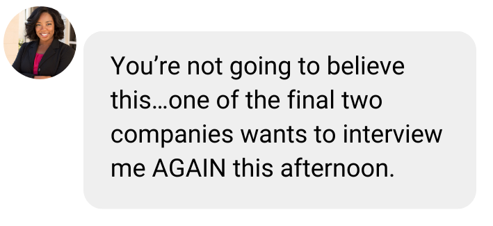 Chief Product Officer → Larger Scope, Better Comp "After 3 interviews that went nowhere, I was frustrated. Within 2 weeks of working together, I had 5 promising conversations and 2 offers. The negotiation strategy alone paid for the coaching investment multiple times over."